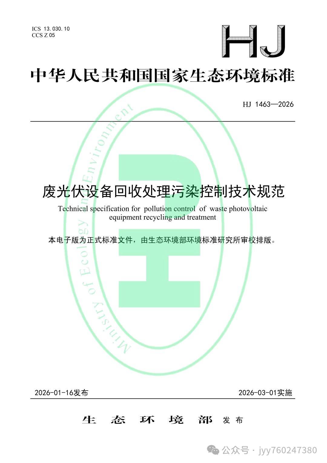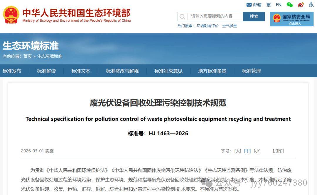 为贯彻《中华人民共和国环境保护法》《中华人民共和国固体废物污染环境防治法》《生态环境监测条例》等法律法规,防治废光伏设备回收处理过程的环境污染,保护生态环境,规范和指导废光伏设备回收处理过程的污染控制,制定《废光伏设备回收处理污染控制技术规范(HJ 1463—2026)》。主要起草单位包括生态环境部固体废物与化学品管理技术中心、生态环境部华南环境科学研究所、、清华大学、中国科学院广州能源研究所、中国环境科学研究院。标准规定了废光伏设备拆卸、收集、运输、贮存、拆解、综合利用和处置过程中污染控制技术要求,